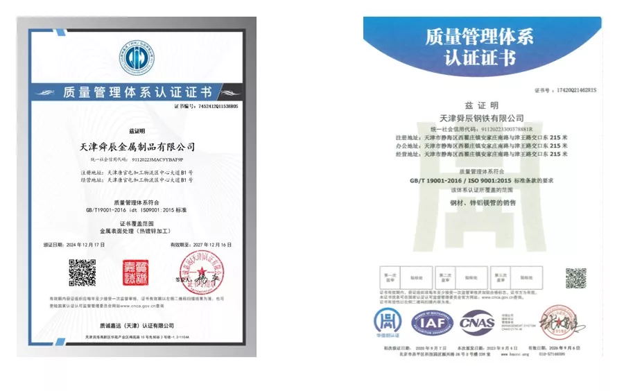Неліктен бізді таңдайсыз? Тяньцзинь Шунчэн индустриясы өнім сапасының берік негізін қалап, 12 жылдық рекордты нөлдік дефолт және нөлдік сапа оқиғаларының рекордын сақтай отырып, жылдар бойы жинақталған өндіріс технологиясымен мақтана алады. Компания ұлттық өндіріс стандарттарын қатаң сақтайды және ISO 9000, 3A жүйесінің сертификаттары мен ЕО CE сертификатына ие. 12-қадамдық процесс және 3-қабатты толық тексеру механизмі арқылы ол жыл сайын нөлдік сапа мен қауіпсіздік инциденттеріне қол жеткізеді және 12 жыл ішінде нөлдік тапсырысты орындамай, өзінің дәлелденген күшін көрсетеді. Әрбір дайын өнім орау және жөнелту алдында кептіруден, тексеруден және жақсы өңдеуден өтеді, бұл жоғары сапаны қамтамасыз етеді. Компанияда 300-ден астам өндірістік жұмысшылар жұмыс істейді және ERW болат құбырларының 236 спецификациясын шығара алады, бұл спецификациялардың толық спектрін ұсынады және әртүрлі қажеттіліктерді дәл қанағаттандыру үшін теңшеуді қолдайды.
