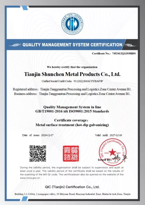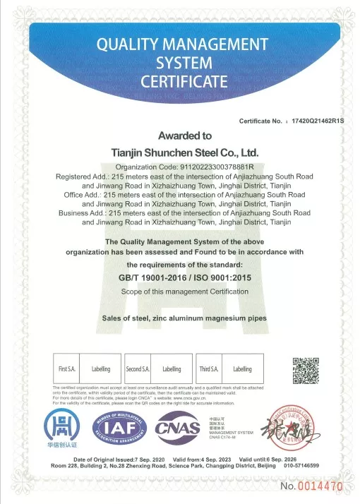 Стандарттар: GB/T 3091-2015 «Төмен қысымды сұйықтықтарды тасымалдауға арналған дәнекерленген болат құбырлар», GB/T 13912-2020 «Ыстық мырышталған болат құбырлар». Өнім үшінші тарап сынақтарынан өтті және сынақ есебі бар.