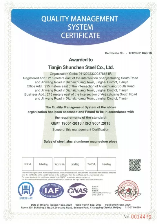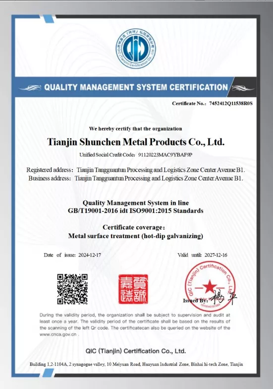 Shunchen Industrial компаниясының Steel U бөлімі ұлттық стандарттарға сәйкес келетін ISO9001 сапа сертификатын алды. Біз үшінші тараптың материалды сынау есептерін және мырыштау қалыңдығының сертификаттарын береміз. Біздің өндірісіміз 20 жылдан астам өндірістік тәжірибемен нығайтылған 12 қатаң технологиялық қадамдардан өтетін озық өндірістік желілерді пайдаланады. Біз 12 жыл бойы нөлдік келісім-шартты бұзу және нөлдік жыл сайынғы сапа оқиғаларының тәжірибесін сақтадық. Өндіріс процесінде мырышталған өнімдердің сілтіге қарсы тұрақтылығын арттыру үшін үш пассивациялық өңдеу қолданылады. Әрбір дайын өнім орау және жөнелту алдында кептіруден, тексеруден және өңдеуден өтеді. Компанияның ISO 9000, 3A жүйесінің сертификаттары және ЕО CE сертификаттары бар. 12 процесс қадамы және үш деңгейлі кешенді тексеру механизмі арқылы біз нөлдік жыл сайынғы сапа мен қауіпсіздік инциденттеріне қол жеткіздік және 12 жыл бойы нөлдік келісім-шартты бұзу рекордын сақтадық.