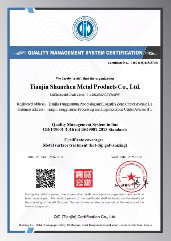 Сенімді сапа үшін Shunchen таңдаңыз. Біз коррозияға төзімділік үшін ыстық мырыштау арқылы өңделген Q235B немесе Q355B жоғары сапалы болатты қолданамыз. Мырыш жабынының берік жабысуын және өткізіп алған жерлерді болдырмау үшін мырыш ыдысының температурасы 450-460 градус Цельсий диапазонында дәл бақыланады. Біздің өнімдер ISO9001 сапа жүйесінің сертификатына сәйкес келеді және үшінші тараптың мырыш жабындысын тексеру есептерімен расталады.
